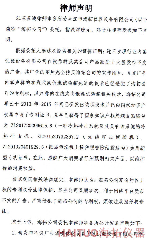 海拓儀器律師聲明:反對侵權(quán)行為 維護公司和消費者權(quán)益摘要:國內(nèi)試驗設(shè)備領(lǐng)先者吳江市海拓儀器設(shè)備有限公司委托律師事務(wù)所發(fā)布了律師聲明,該聲明指出,當前市面上出現(xiàn)了產(chǎn)品專利侵犯海拓儀器權(quán)益,海拓儀器將以法律手段維護自身利益。該律師聲明要求某試驗設(shè)備有限公司立即停止侵權(quán)行為,扯下其在網(wǎng)絡(luò)平臺的相關(guān)廣告和宣傳畫冊并同時停止生產(chǎn)同款設(shè)備。如果該設(shè)備公司不聽勸解,海拓儀器將向人民法院依法起訴該公司侵權(quán)行為,以維護自身合法權(quán)益和維護客戶消費權(quán)益,并建議廣大消費者仔細甄別相關(guān)產(chǎn)品。? ? ? ?近日,吳江市海拓儀器設(shè)備有限公司委托律師事務(wù)所發(fā)布了律師聲明,該聲明指出,當前市面上出現(xiàn)了產(chǎn)品專利侵犯海拓儀器權(quán)益,海拓儀器將以法律手段維護自身利益。??事件源起于海拓儀器發(fā)現(xiàn)市面上有同類設(shè)備公司通過完全拷貝海拓儀器產(chǎn)品宣傳圖片,在微信群及該公司產(chǎn)品畫冊上大量發(fā)布不實廣告。??聲明指出,該廣告聲稱的在線式高低溫試驗箱的技術(shù)侵犯了海拓儀器的專利權(quán),該產(chǎn)品專利由海拓儀器