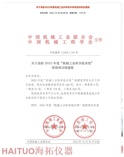 海拓儀器榮獲2022年度中國機械工業(yè)科學技術(shù)獎?ICC訊?10月20日,2022年度“中國機械工業(yè)科學技術(shù)獎”項目名錄正式發(fā)布,由海拓儀器(江蘇)有限公司完成的“超快速冷熱沖擊試驗系統(tǒng)關(guān)鍵技術(shù)研究與系列應(yīng)用”項目榮獲2022年度“中國機械工業(yè)科學技術(shù)獎”三等獎。??據(jù)了解,中國機械工業(yè)科學技術(shù)獎是根據(jù)《國家科學技術(shù)獎勵條例》和《社會力量設(shè)立科學技術(shù)獎管理辦法》的有關(guān)規(guī)定,由中國機械工業(yè)聯(lián)合會和中國機械工程學會共同設(shè)立并經(jīng)國家科學技術(shù)部批準,在國家科技獎勵主管部門登記的面向全國機械行業(yè)的綜合性科技獎項。旨在表彰在機械工業(yè)科技工作中作出突出貢獻的單位和人員,獎勵范圍包括:機械工業(yè)科學技術(shù)發(fā)明成果、機械工業(yè)科學技術(shù)進步成果、機械工業(yè)工程化和新技術(shù)推廣成果和機械工業(yè)軟科學和標準成果。??海拓儀器是一家集研發(fā)、制造、貿(mào)易于一體高科技現(xiàn)代化公司,公司成立于2005年,主要產(chǎn)品包括:超快速冷熱沖擊試驗機(熱流儀)、快速溫變應(yīng)力篩選試驗箱(ESS),